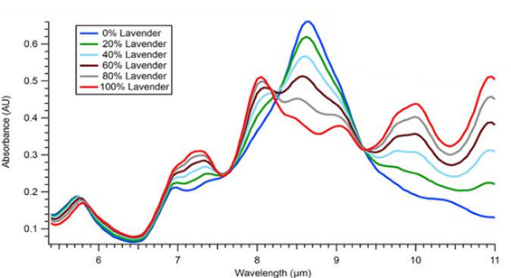 Ocean MZ5測(cè)量了用杏仁油(一種普通摻釋物)稀釋的薰衣草油樣品的一系列吸收光譜,光譜差異揭示了濃度相關(guān)差異。光譜數(shù)據(jù)再使用化學(xué)計(jì)量分析可以獲得更多額外信息。