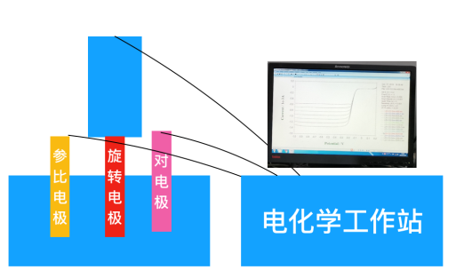 電化學(xué)工作站用于對工作電極施加一定的激發(fā)信號比如電壓(這個電壓是相對于參比電極的),電解溶液內(nèi)的氧氣在工作電極頭表面與樣品(催化劑)接觸,受到電化學(xué)工作站的電壓激發(fā)后,會發(fā)生還原反應(yīng),產(chǎn)生還原電流,也就是負(fù)電流。產(chǎn)生的電信號再通過電化學(xué)工作站進(jìn)行測量,研究人員根據(jù)轉(zhuǎn)速、電信號以及一些其它參數(shù),即可研究Pt催化劑的性能。