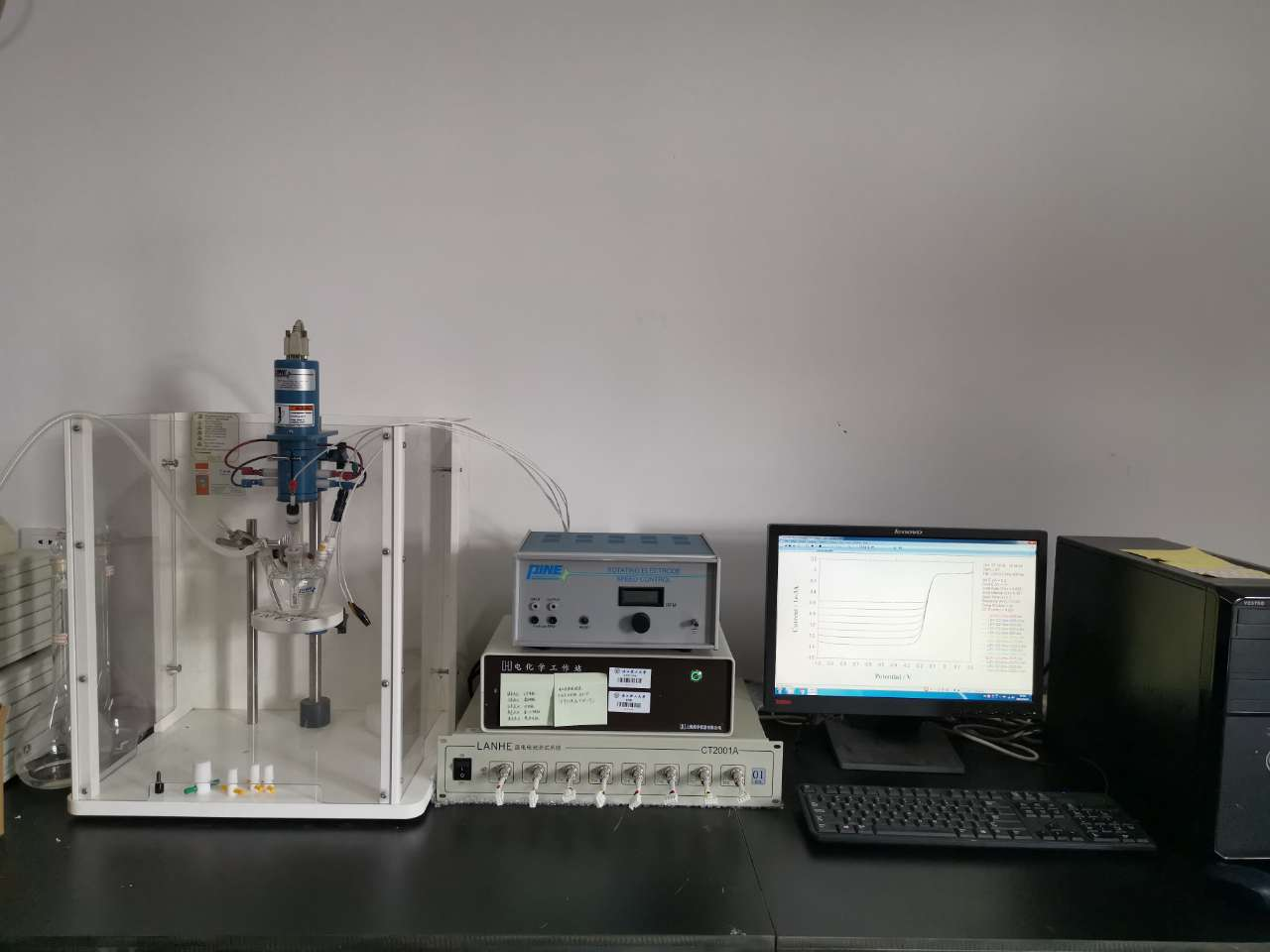 圖2:旋轉(zhuǎn)圓盤電極裝置與電化學(xué)工作站聯(lián)用實(shí)物圖
