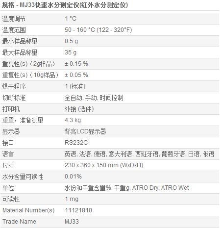 MJ33緊湊型快速水分測定儀 日常測定的堅固之選 MJ33水分測定儀為日常水分測定提供了堅固的設計、簡便的水分測定功能及便捷的操作。特別適用于工業(yè)環(huán)境,如:原料入庫的水分含量測定。 金屬加熱單元和簡便的操作確保無差錯的樣品水分快速測定; 簡便的功能簡化了日常水分測定工作; 默認水分測定終點判斷,關(guān)機條件無需編程設置; MJ33水分測定儀 - 日常水分測定的堅固和可靠之選