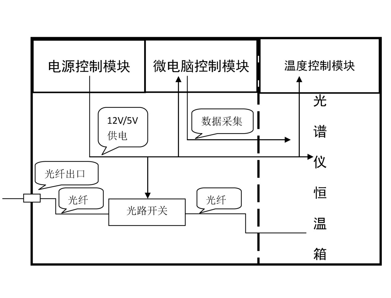 該恒溫及電源控制箱包含IP67防護(hù)箱、電源控制部分、微電腦控制部分、溫濕度控制等部分(圖1)。配合海洋光學(xué)(Ocean Insight Inc.)的QEpro、FLAME等高靈敏度光纖光譜儀,可用于植被葉綠素?zé)晒饧案吖庾V野外連續(xù)穩(wěn)定的高頻觀測(cè)。
