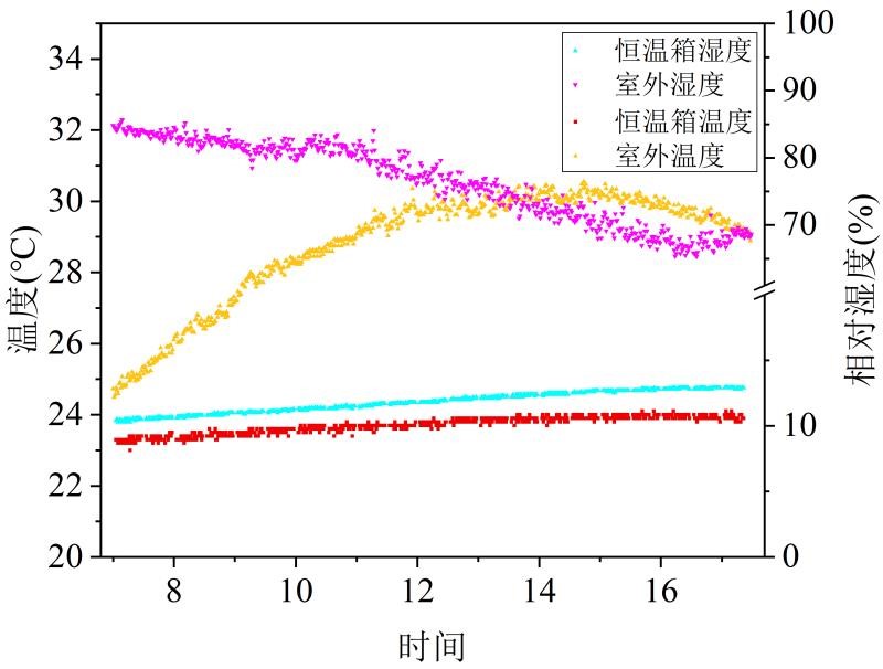 QEpro和FLAME等光譜儀放置在控制箱的恒溫室內(nèi),采用半導(dǎo)體TEC制冷,精準(zhǔn)控溫,使恒溫室內(nèi)的溫度變化控制在25±1℃(圖2),恒溫室溫度可通過(guò)軟件自由設(shè)定,設(shè)備工作溫度須高于-10℃低于40℃。該設(shè)備可實(shí)時(shí)監(jiān)控恒溫箱的溫濕度以及機(jī)箱內(nèi)部的環(huán)境溫濕度。
